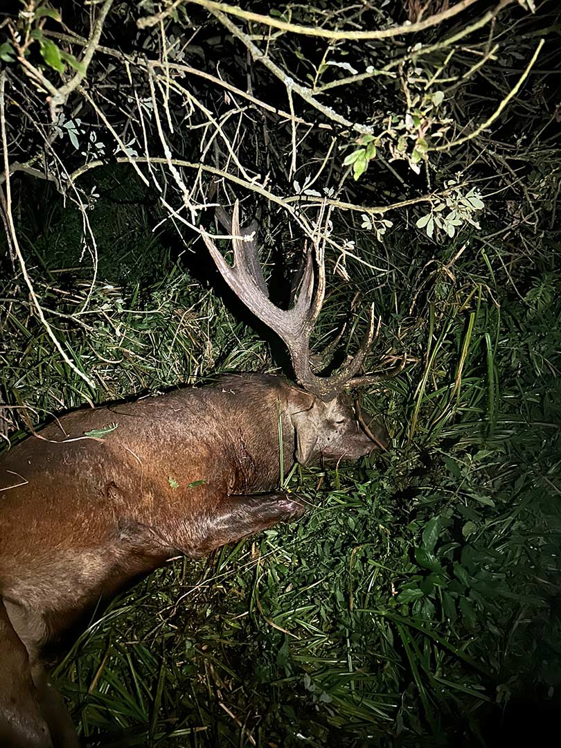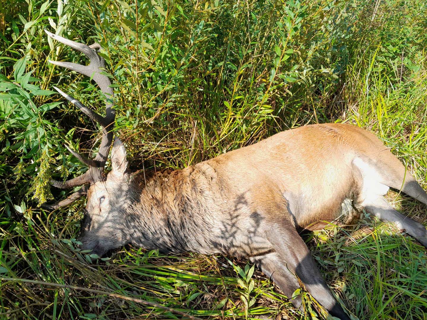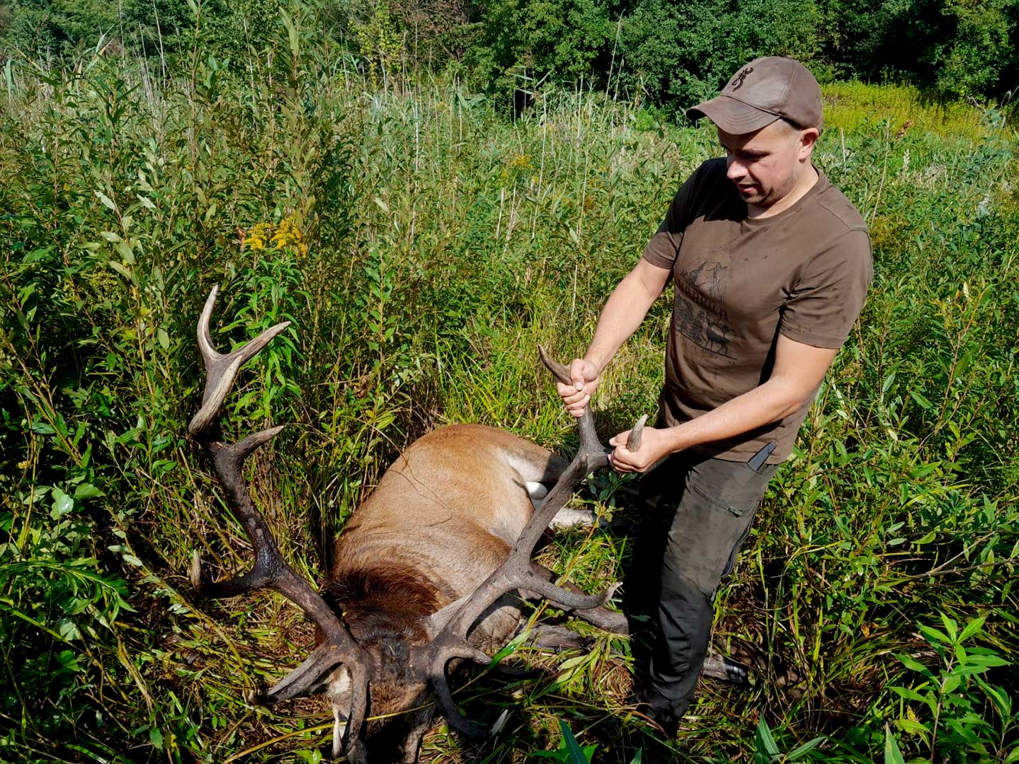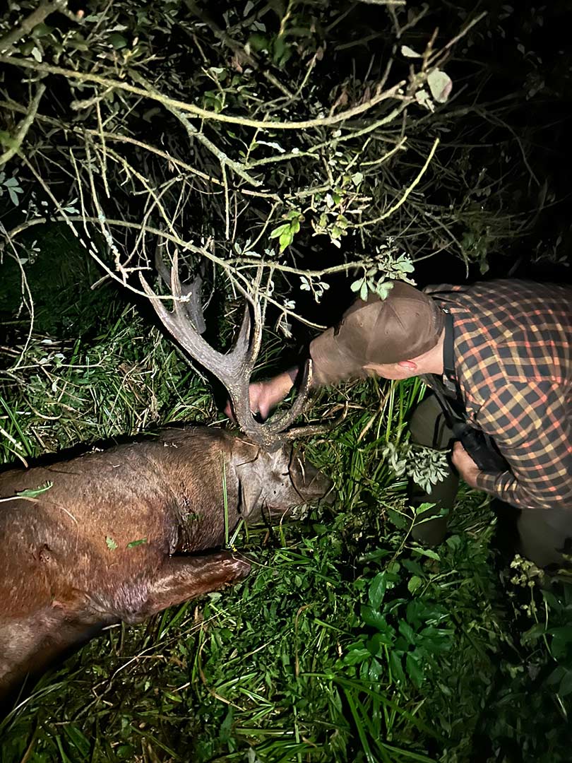 Już trochę po zachodzie słońca i zaczyna zapadać zmrok, gdy podchodzimy pięknego starego byka. Byk pomrukuje i jego sylwetka jest piękna w lunecie mojego sztucera. Strzał przerywa na chwilę koncert jeleni. My po strzale udajemy się na zestrzał i farba kieruje nas w kierunku leżącego byka. Pan Krzysztof poszedł po pomoc w transporcie do chłodni. Ja zostaję przy byku. Noc już szybko zapada i po dobrej chwili zaczyna wyłaniać się z pomiędzy drzew blask księżyca. Jest krótko po pełni, ale księżyc oświetla cały teren jakby był dzień. Po powrocie na kwaterę patrzę na telefon i widzę, że zrobiliśmy dzisiaj ponad 11 km.