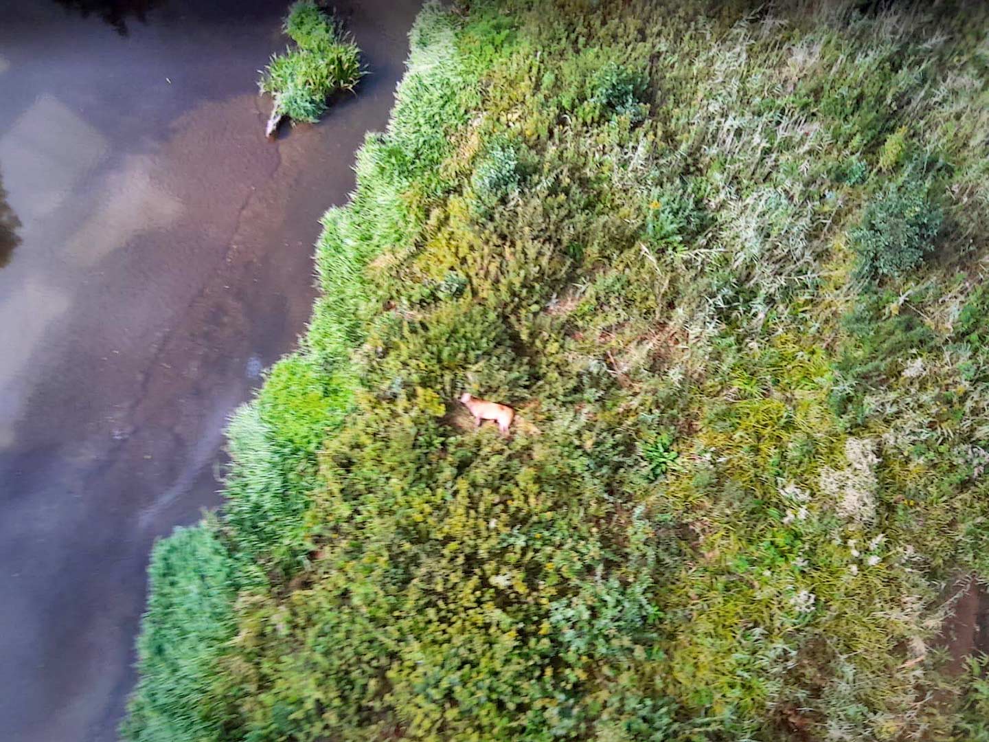 Jednak Krzysztof na następny dzień postanawia zadzwonić do znajomego, który ma drona z aparatem termowizyjnym. Drona puszczają do góry przy rzece, gdzie psy straciły trop. Po kilku minutach lotu, dron fotografuje jedyną wysepkę na tej rzeczce oddaloną o 400 metrów od wejścia byka do wody. Byk leży na środku wysepki. Psy nie mogły złapać tropu w wodzie, więc dron tym razem stał się naszym sprzymierzeńcem.