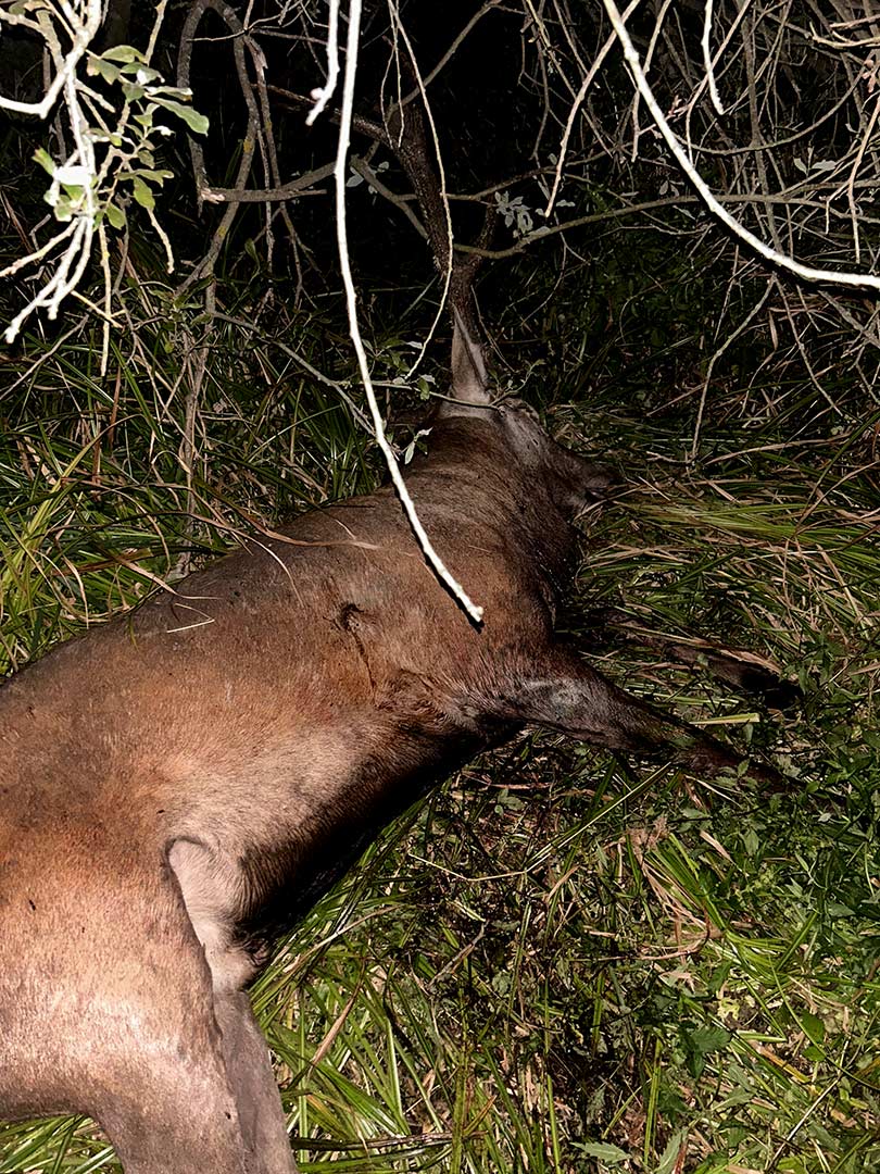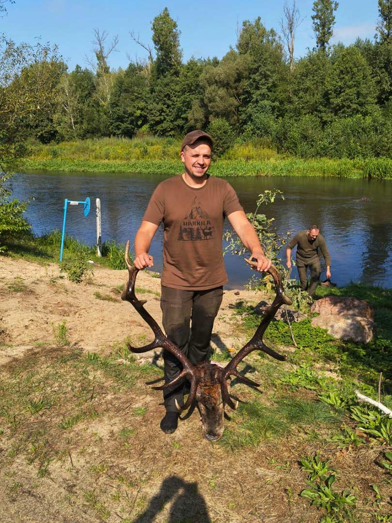 Już trochę po zachodzie słońca i zaczyna zapadać zmrok, gdy podchodzimy pięknego starego byka. Byk pomrukuje i jego sylwetka jest piękna w lunecie mojego sztucera. Strzał przerywa na chwilę koncert jeleni. My po strzale udajemy się na zestrzał i farba kieruje nas w kierunku leżącego byka. Pan Krzysztof poszedł po pomoc w transporcie do chłodni. Ja zostaję przy byku. Noc już szybko zapada i po dobrej chwili zaczyna wyłaniać się z pomiędzy drzew blask księżyca. Jest krótko po pełni, ale księżyc oświetla cały teren jakby był dzień. Po powrocie na kwaterę patrzę na telefon i widzę, że zrobiliśmy dzisiaj ponad 11 km.