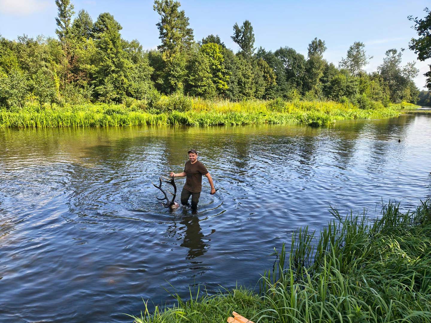Kolega Krzysztof i Kuba dochodzili go przez trzy godziny i doszli do rzeczki - granicy obwodu. Dalsze szukanie zostawiają na jutro. Jutro też ma być drugi kolega z psem z Nadleśnictwa Józefów, który jest też świetnym tropowcem. Niestety całą noc pada deszcz. Drugi pies, który został puszczony tą samą drogą od zestrzału, dochodzi do tego samego miejsca w rzeczce granicznej i gubi trop. Przewodnik przenosi psa na drugą stronę rzeczki (po pas w wodzie), ale pies nie podejmuje tropu - 300 m w lewo, 300 w prawo i nic.