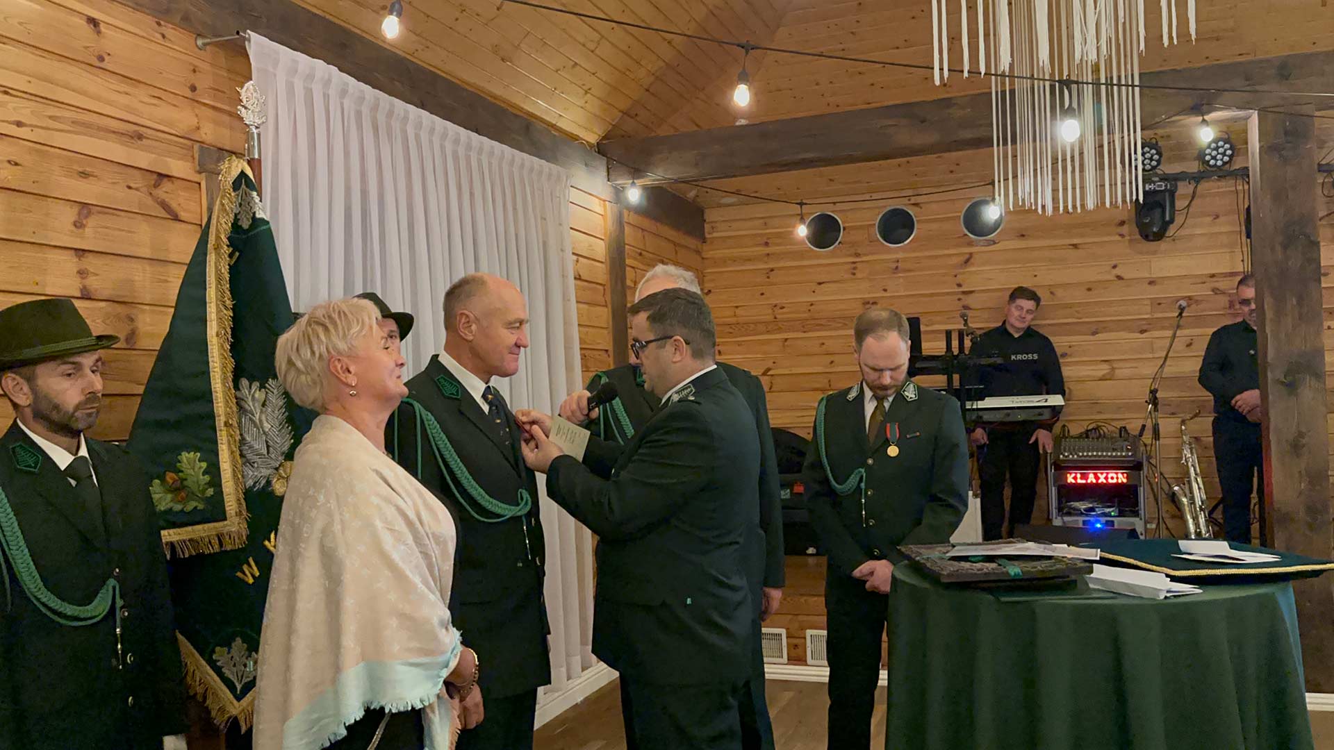 Dekorowanie srebrnymi medalami za zasługi dla łowiectwa Tomasza Morawskiego, oraz Michała Rapciaka w imieniu którego medal odbiera córka Beata Leniartek.