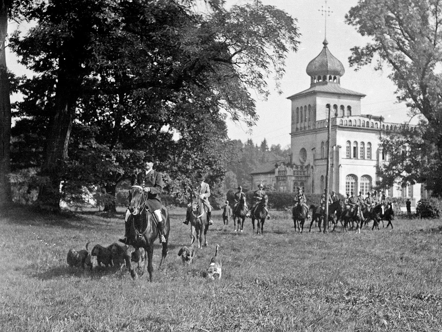 Wyjazd na zawody z zamku właścicieli Osieka pp. Rudzińskich. Prowadzi major Eryk Pfann.