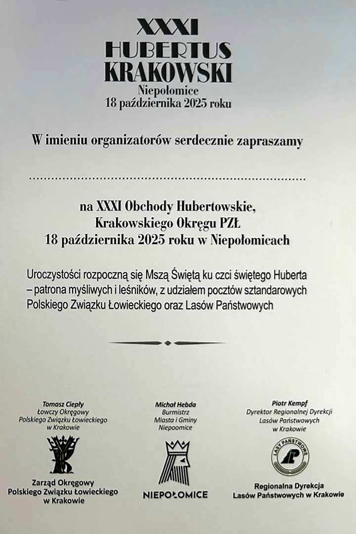 XXXI Hubertus Krakowski - Niepołomice, 18.10.2025. - zaproszenie
